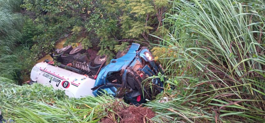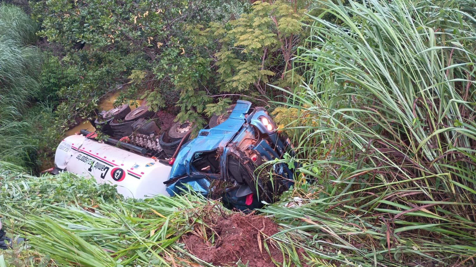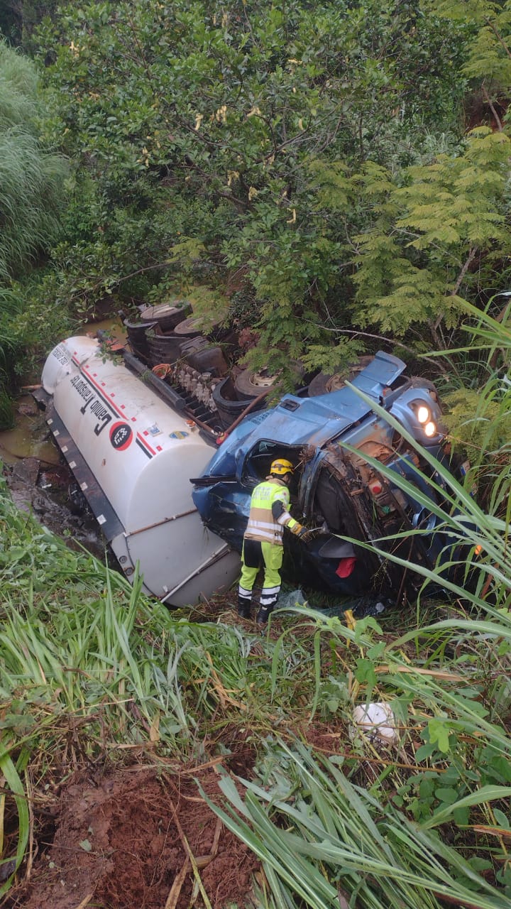 No local, foi encontrado um caminhão-tanque pertencente à empresa Camilo Transportes, que estava tombado fora da pista de rolamento. Dentro do veículo, os policiais visualizaram o condutor, aparentemente já sem vida.