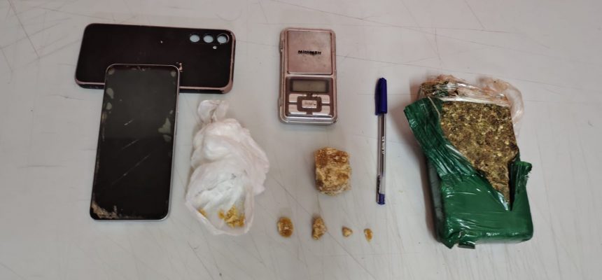 Em varredura pela rota de fuga, os militares localizaram um tablete grande de substância semelhante à maconha. Logo em seguida, foram encontrados uma pedra grande, quatro pedras menores e fragmentos de crack, acondicionados em uma sacola plástica, além de uma balança de precisão, um aparelho celular e a motocicleta utilizada na ação.
