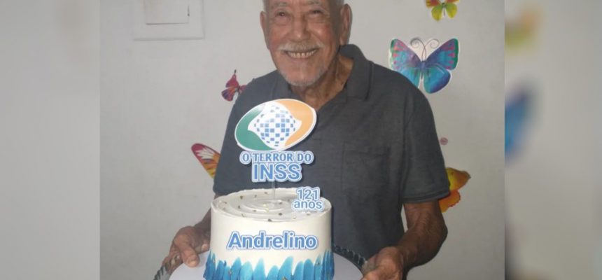 O aposentado Andrelino Vieira da Silva comemorou o aniversário de 121 anos de idade com um bolo temático em Aparecida de Goiânia, na Região Metropolitana da capital. Neta dele, a supervisora contábil Janaina Lemes de Souza, de 36 anos, mandou fazer o doce com o tema: “O terror do INSS”.