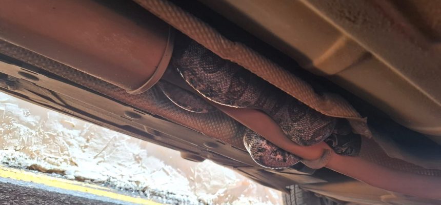 De acordo com informações, a dona de um carro percebeu a presença da cobra no estacionamento e viu o momento em que o animal se abrigou debaixo do veículo. O Corpo de Bombeiros foi acionado e compareceu rapidamente ao local para realizar a captura segura da serpente.