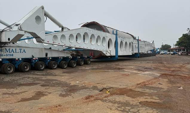 O veículo tem 123 metros de comprimento e transporta uma peça industrial de 636,5 toneladas, com 5,7 metros de altura e 7 metros de largura. A carga, que estava estacionada em Patos de Minas, atravessará a região com destino a Edealina (GO).