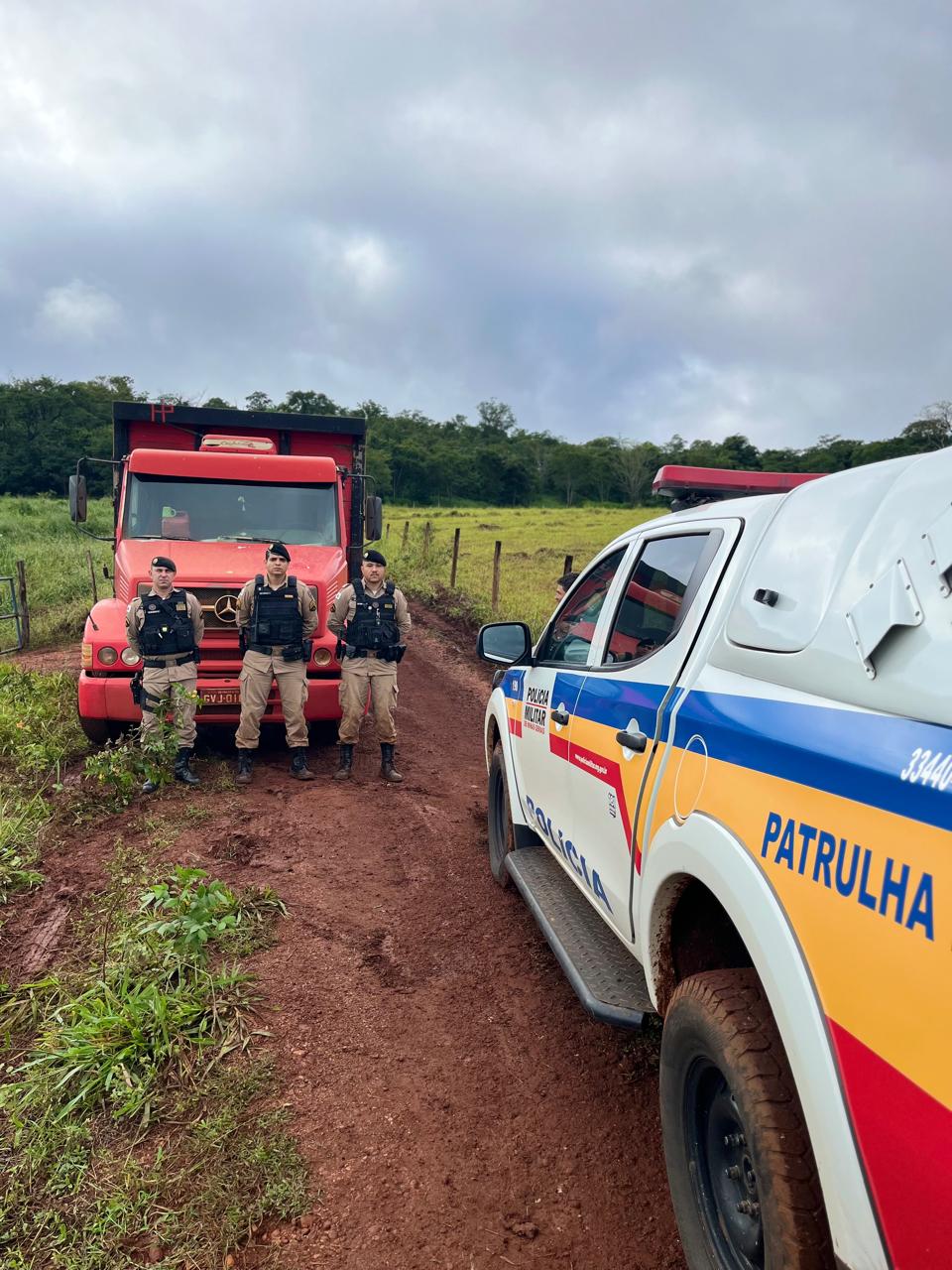 De imediato, os militares iniciaram diligências, realizando levantamentos e análise de imagens de estradas da região. A ação permitiu a identificação de um caminhão boiadeiro Mercedes-Benz L1113, de cor azul, como possível veículo utilizado no crime.