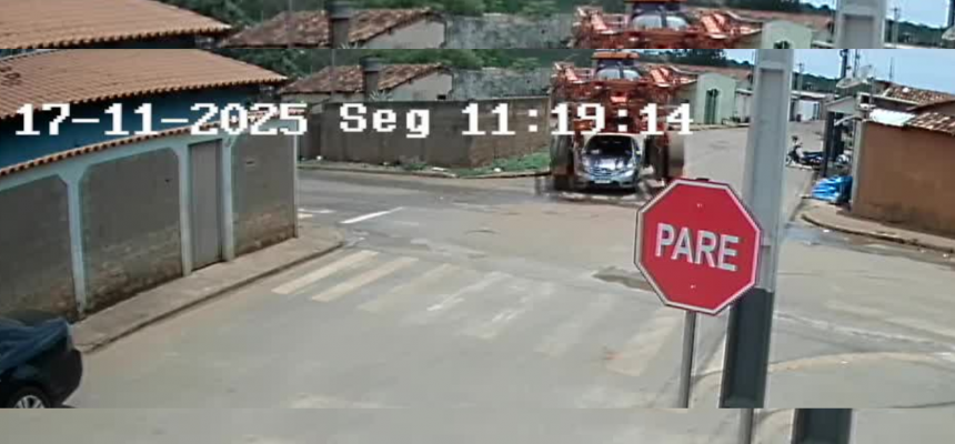Na manhã de hoje, segunda feira (17), por volta das 11h19, um trator pulverizador colidiu com um carro ao realizar uma conversão em uma esquina em Iraí de Minas. Toda a ação foi registrada por uma câmera de segurança, que mostra o momento exato do impacto.